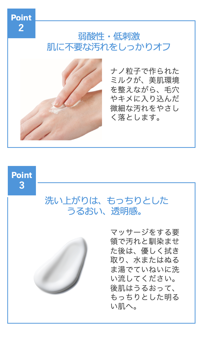 肌バリアをサポートし、若々しい肌へと導く「独自OLT製法※1」で作られたミルクタイプのクレンジングです。ナノサイズのミルクがうるおいを守りながら、毛穴やキメに入り込んだメイク・皮脂などの微細な汚れを落とすだけでなく、内側※2のうるおい力を高め、みずみすしい透明感のある明るい肌へと導きます。